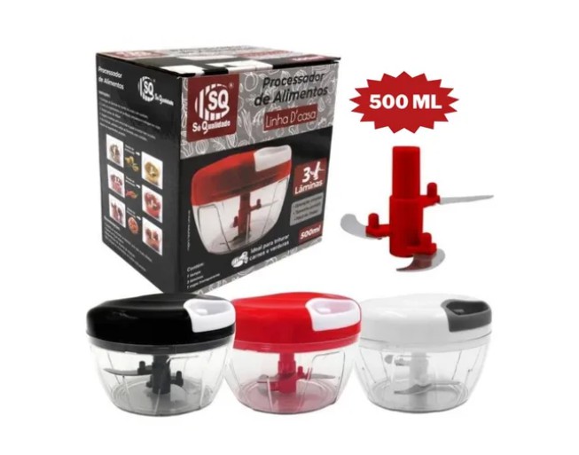 Ele possui três lâminas Inox para corte com tampa plástica, puxador e uma tampinha onde pode sair todo o liquido processado, um pote transparente e acionamento giratório através de corda retrátil. Processa os alimentos de forma rápida e eficiente